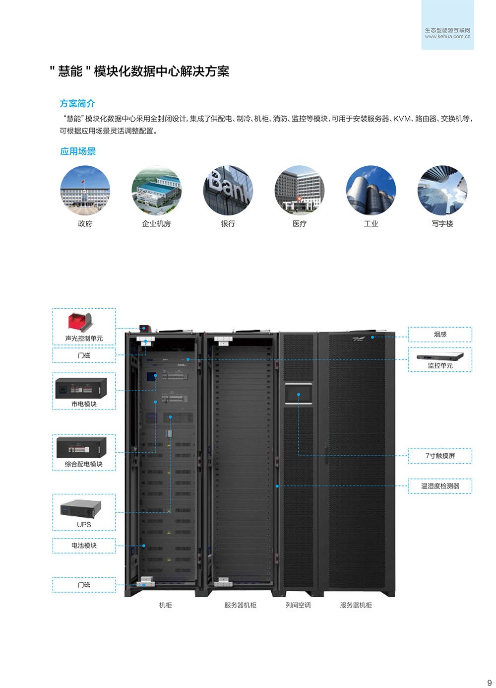 模块化方案● 模块化方案产品实现标准模块化,根据客户业务需求,将UPS、空调、配电、监控等功能模块整合为一, 积木式灵活快速地搭建简单、经济、按需的数据中心。标准化的同时,产品化也带来系统的高可靠性,且部署上线更快,管理也更简单。